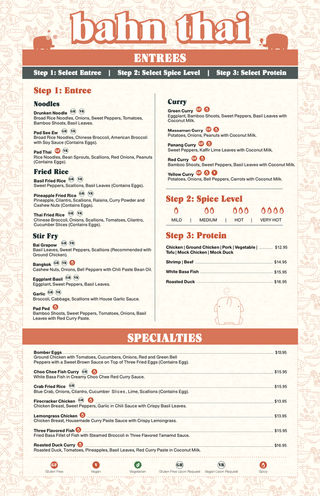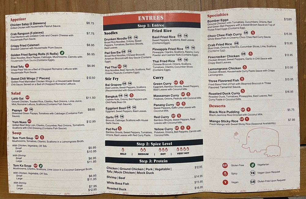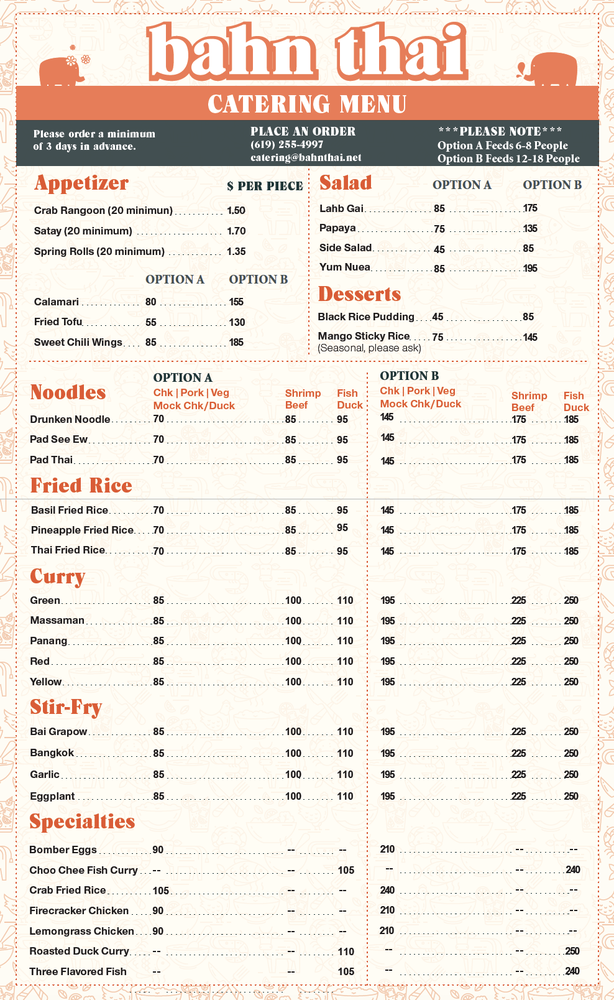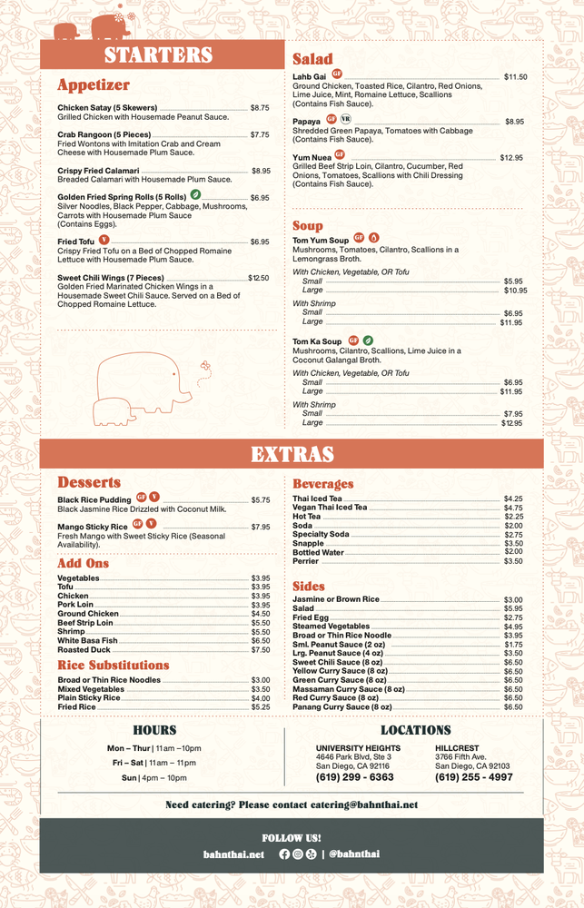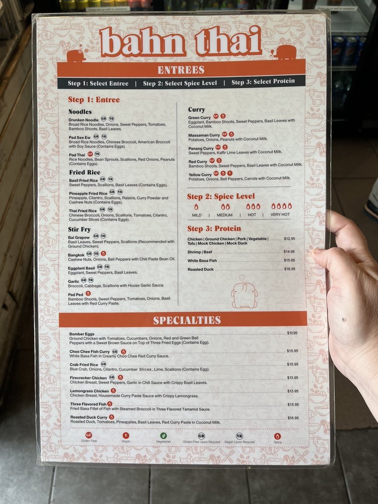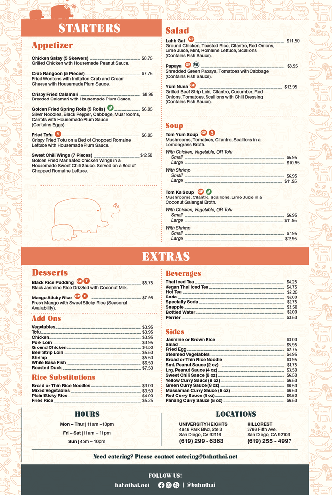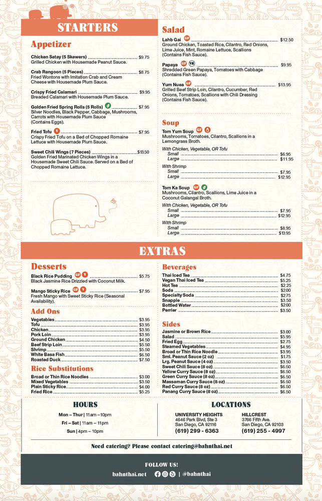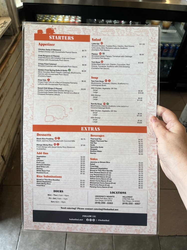 Introducing the menu at Bahn Thai, located in San Diego, is a must for all Thai food enthusiasts. This Asian-owned gem offers a range of authentic Thai dishes with a variety of options for vegans and vegetarians. The Pineapple Fried Rice stands out for its flavorful blend with a hint of curry, while the Yum Nuea beef salad packs a zesty punch. Customers rave about the high-quality, fresh ingredients and customizable spice levels. The Tom Yum soup may fall short for some, but the overall experience is elevated by dishes like the Panang Curry and Yellow Curry with tofu. The lack of seating is compensated by quick service and delightful flavors, making Bahn Thai a top spot for Thai cuisine in Southern California.